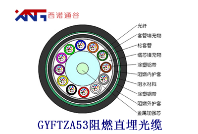 GYFTZA53(非金屬加強構(gòu)件、松套層絞填充式、鋁-聚乙烯粘結(jié)護套、縱包皺紋鋼帶鎧裝、阻燃聚乙烯套通信用室外光纜)光纜的結(jié)構(gòu)是將單?;蚨嗄9饫w套入由高模量的塑料做成的內(nèi)填充防水化合物松套管中。纜芯的中心是一根金屬加強芯,對于某些芯數(shù)的光纜來說,金屬加強芯外還擠包一層聚乙烯(PE)。松套管(和填充繩)圍繞中心加強芯絞合成緊湊和圓形的纜芯,纜芯內(nèi)的縫隙充以阻水化合物。涂塑鋁帶縱包后擠一層聚乙烯內(nèi)護套,雙面涂塑鋼帶縱包后擠塑阻燃聚乙烯護套。