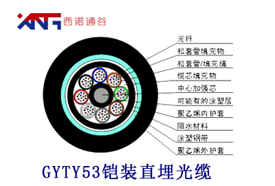 GYTY53(金屬加強(qiáng)構(gòu)件、松套層絞填充式、聚乙烯護(hù)套、縱包皺紋鋼帶鎧裝、聚乙烯套通信用室外光纜)光纜的結(jié)構(gòu)是將單模或多模光纖套入由高模量的塑料做成的內(nèi)填充防水化合物松套管中。纜芯的中心是一根金屬加強(qiáng)芯,對(duì)于某些芯數(shù)的光纜來(lái)說(shuō),金屬加強(qiáng)芯外還擠包一層聚乙烯(PE)。松套管(和填充繩)圍繞中心加強(qiáng)芯絞合成緊湊和圓形的纜芯,纜芯內(nèi)的縫隙充以阻水化合物。纜芯外擠一層聚乙烯內(nèi)護(hù)套,雙面涂塑鋼帶縱包后擠塑聚乙烯護(hù)套。